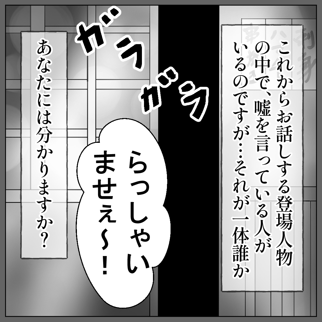 『誰が嘘をついてる?』第①〜②話 2022年12月20日 『誰が嘘をついてる?』第①〜②話今回はフォロワーの「望さん」から届いたお話です♪嘘で塗り固められた人は、誰だか分かりますか??>>前回はこちら『黒い人』第③~④話『誰が嘘をついてる?』第①話『誰が嘘をついてる?』第②話>>次回はこちら『誰が嘘をついてる?』第③話〜>>前回はこちら『黒い人』第③~④話>>他の作品「電車でSNSを開いただけなのに』※第①話>>前回はこちら『皆が私を知っている』第①~②話>>インスタはこちら < 前の記事次の記事 > コメント コメントフォーム 名前 コメント 記事の評価 リセット リセット 顔 星 情報を記憶 コメントを投稿する