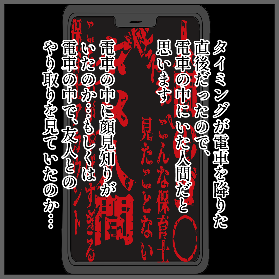 一気読み『電車でSNSを開いただけなのに』※第①~③話 2022年12月03日 先読み『電車でSNSを開いただけなのに』 ※第①~③話を一気読みできます!絵美さんが体験した「人怖話(ヒトコワ)」を紹介させていただきます。今回は人怖(ヒトコワ)話なので、見える子ちゃんではなくても、実際に起こり得てしまうかもしれません...>>前回はこちら『背の高いモノ』第①~②話『電車でSNSを開いただけなのに』第①話『電車でSNSを開いただけなのに』第②話『電車でSNSを開いただけなのに』第③話>>前回はこちら『背の高いモノ』第①~②話>>前回はこちら「宿直室に行けません」最終話>>インスタはこちら < 前の記事次の記事 > コメント コメントフォーム 名前 コメント 記事の評価 リセット リセット 顔 星 情報を記憶 コメントを投稿する